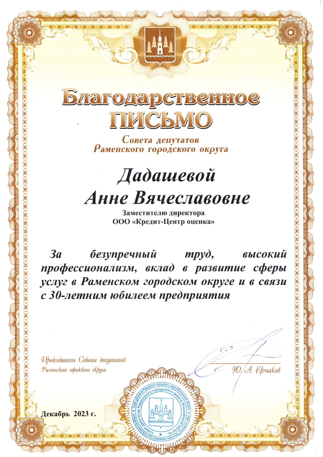Оценщику, заместителю директора ООО «Кредит-Центр оценка», ДАДАШЕВОЙ Анне Вячеславовне, было вручено Благодарственно письмо Совета депутатов Раменского городского округа за высокий профессионализм, вклад в развитие сферы услуг в Раменском городском округе и в связи с 30-летним юбилеем предприятия.